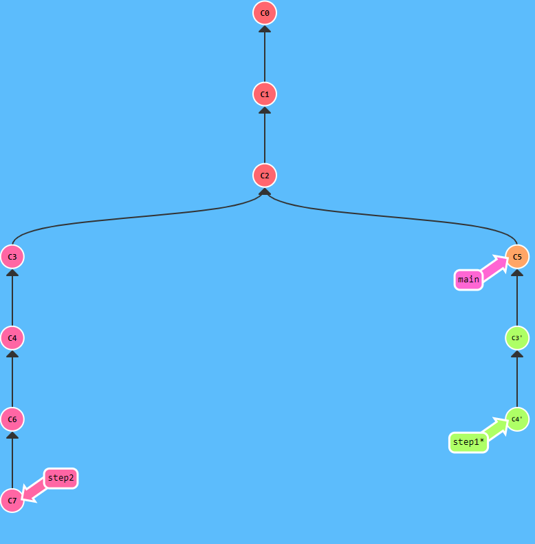 아래는 그림은 rebase 상황을 해당 사이트에서 시뮬레이션 한 것입니다.