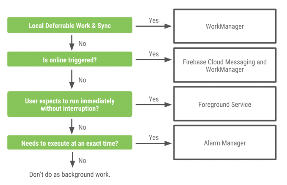 현재는 백그라운드 작업에 대해 WorkManager, Alarm Manager, Service, CoRoutine 이렇게 4가지 솔루션들을 그 상황에 맞게 선택해서 사용해야한다고 생각한다.