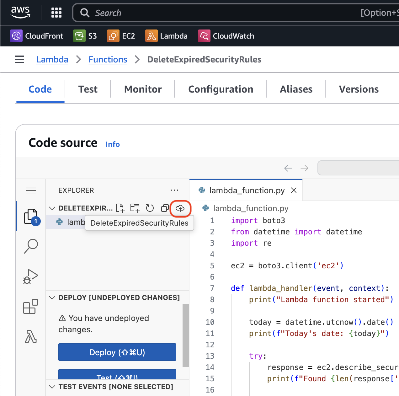 여기까지 작업후 Lamda 에서 test 를 돌리면 보안 규칙중 Describtion 에 이미 지난 날짜의 'exp:0000-00-00' 형식의 데이터를 갖고 있다면 삭제되는 것을 확인할 수 있다.