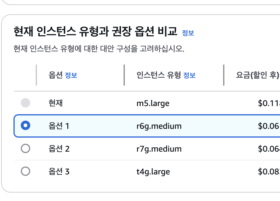 추론하여 얻은 유형(r6g.medium)이 가장 상단으로 추천 되었기에 뿌듯했다.