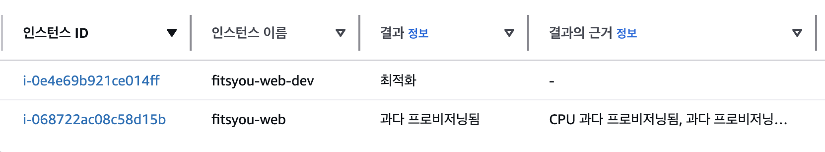 참고) AWS Compute Optimizer위와 같은 의사 결정 후에 AWS Copute Optimizer 결과를 얻을 수 있었다.