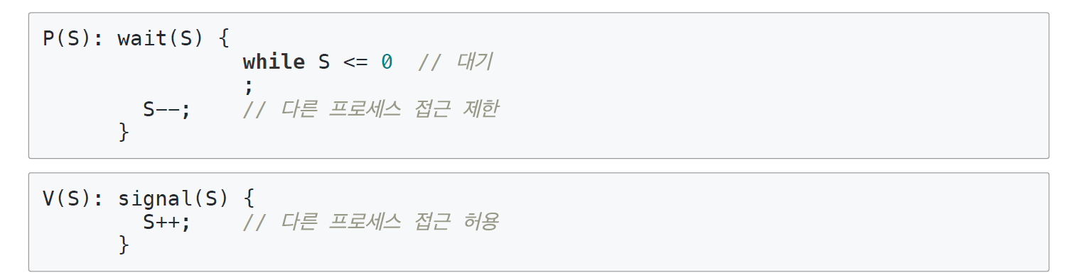 P: 검사 (임계 영역에 들어갈 때) -> S값이 1 이상이면, 임계 영역 진입 후, S값 1을 차감합니다. S값이 0이면 대기합니다.